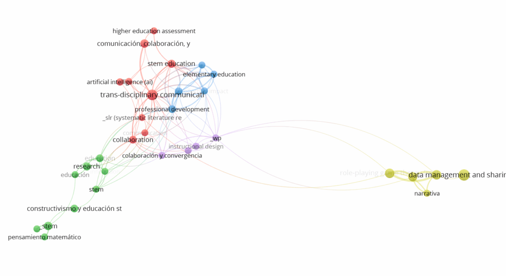 Al interpretar la visualización, observé un núcleo temático donde educación STEM, comunicación transdisciplinaria, colaboración y evaluación aparecieron como ejes recurrentes, conectados con frecuencia con IA, desarrollo profesional, diseño instruccional y enfoques metodológicos como revisión sistemática. También identifiqué un conjunto más separado hacia la derecha, asociado con role-playing games, narrativa y data management and sharing, lo que sugirió una línea temática especializada que se vinculó al centro por pocos puentes. Por último, detecté que 2 palabras clave no quedaron conectadas a la red; las interpreté como términos que, aunque cumplieron el mínimo de apariciones, no co-ocurrieron de manera consistente con las demás palabras clave del corpus y, por eso, funcionaron como “islas” conceptuales dentro del mapa.