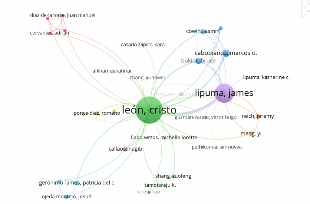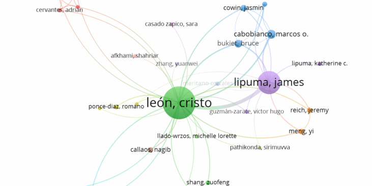 Para aumentar la interpretabilidad y evitar que la red se volviera ilegible, apliqué un criterio de legibilidad: solo incluí a quienes aparecieron en tres o más documentos. Con ese filtro, 30 autores superaron el umbral y conformaron el mapa de colaboradores recurrentes. En la Figura X, mi nombre (“león, cristo”) apareció como nodo central, lo cual fue consistente con un patrón de articulación entre subredes. También se observó a “lipuma, james” como un colaborador de alta recurrencia y conectividad, y se distinguió un subgrupo alrededor de “cabobianco, marcos o.” con colaboraciones cercanas (por ejemplo, “bukiet, bruce” y “cowin, jasmin”), lo que sugirió un eje de coautoría sostenido. En conjunto, la red respaldó una lectura clara para público general: mi agenda no solo produjo resultados, también consolidó una infraestructura humana de investigación, conectando equipos y temas que, de otro modo, habrían permanecido más aislados.