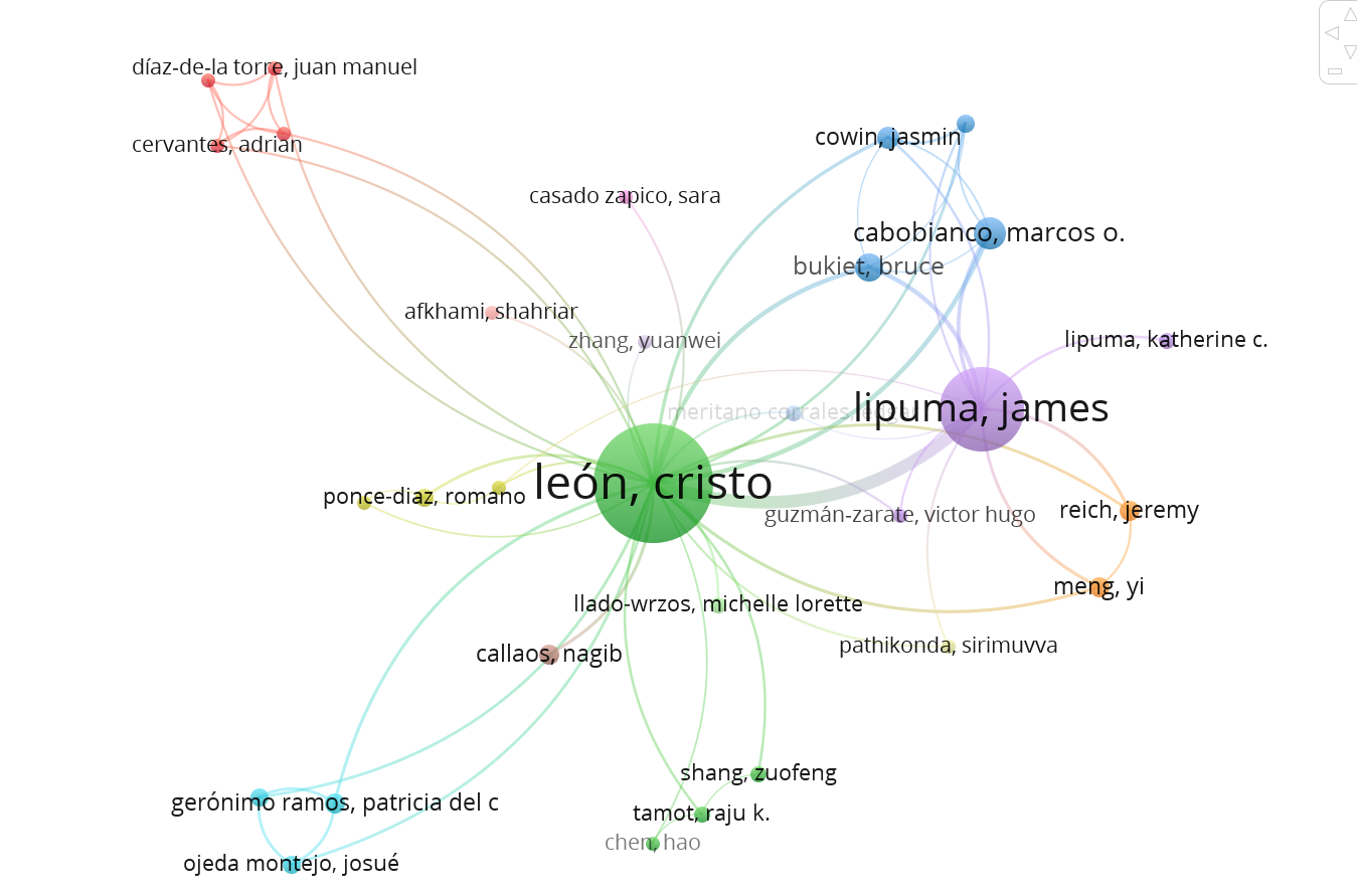 Para aumentar la interpretabilidad y evitar que la red se volviera ilegible, apliqué un criterio de legibilidad: solo incluí a quienes aparecieron en tres o más documentos. Con ese filtro, 30 autores superaron el umbral y conformaron el mapa de colaboradores recurrentes. En la Figura X, mi nombre (“león, cristo”) apareció como nodo central, lo cual fue consistente con un patrón de articulación entre subredes. También se observó a “lipuma, james” como un colaborador de alta recurrencia y conectividad, y se distinguió un subgrupo alrededor de “cabobianco, marcos o.” con colaboraciones cercanas (por ejemplo, “bukiet, bruce” y “cowin, jasmin”), lo que sugirió un eje de coautoría sostenido. En conjunto, la red respaldó una lectura clara para público general: mi agenda no solo produjo resultados, también consolidó una infraestructura humana de investigación, conectando equipos y temas que, de otro modo, habrían permanecido más aislados.