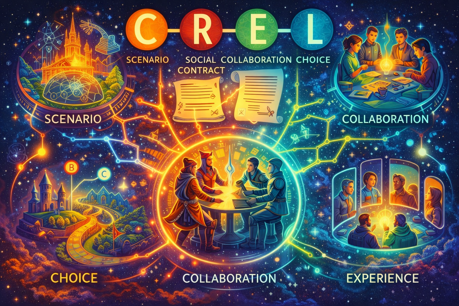 El marco CREL articula cinco componentes clave—Escenario, Contrato Social, Colaboración, Elección y Experiencia—que, en conjunto, facilitan aprendizajes auténticos y transformadores. El juego se presenta como un mecanismo riguroso para el aprendizaje experiencial y la comunicación transdisciplinaria.